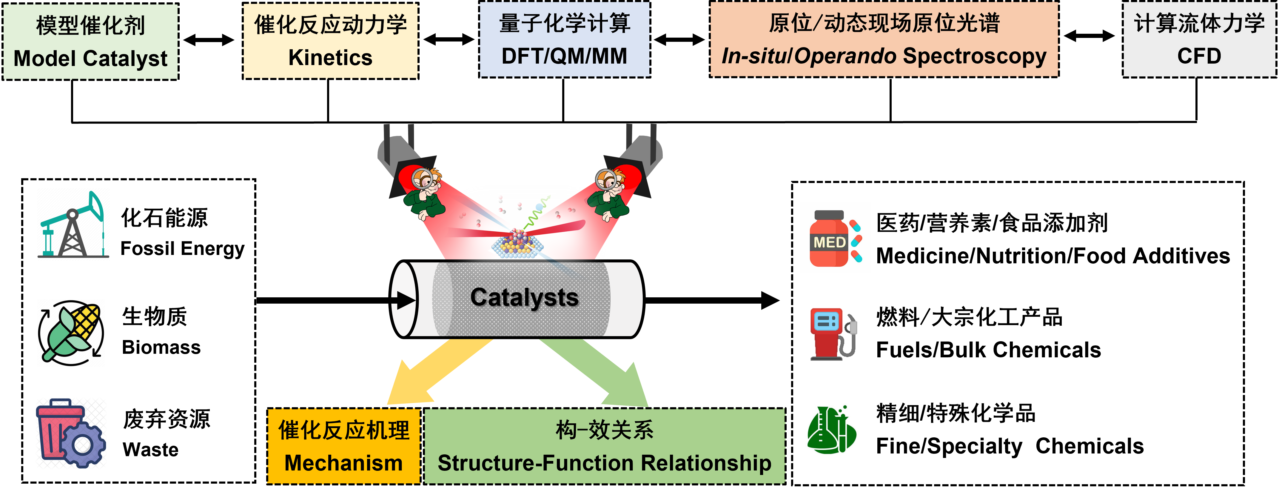 擅长模型催化剂构筑、催化反应微观动力学、同位素示踪、(准)原位和动态现场原位光谱表征、量子化学和计算流体力学研究,从多尺度理解并揭示催化剂组成、结构与反应性能之间的构-效关系以及催化反应机理,指导催化剂理性设计和新反应过程开发。具体研究课题如下:
