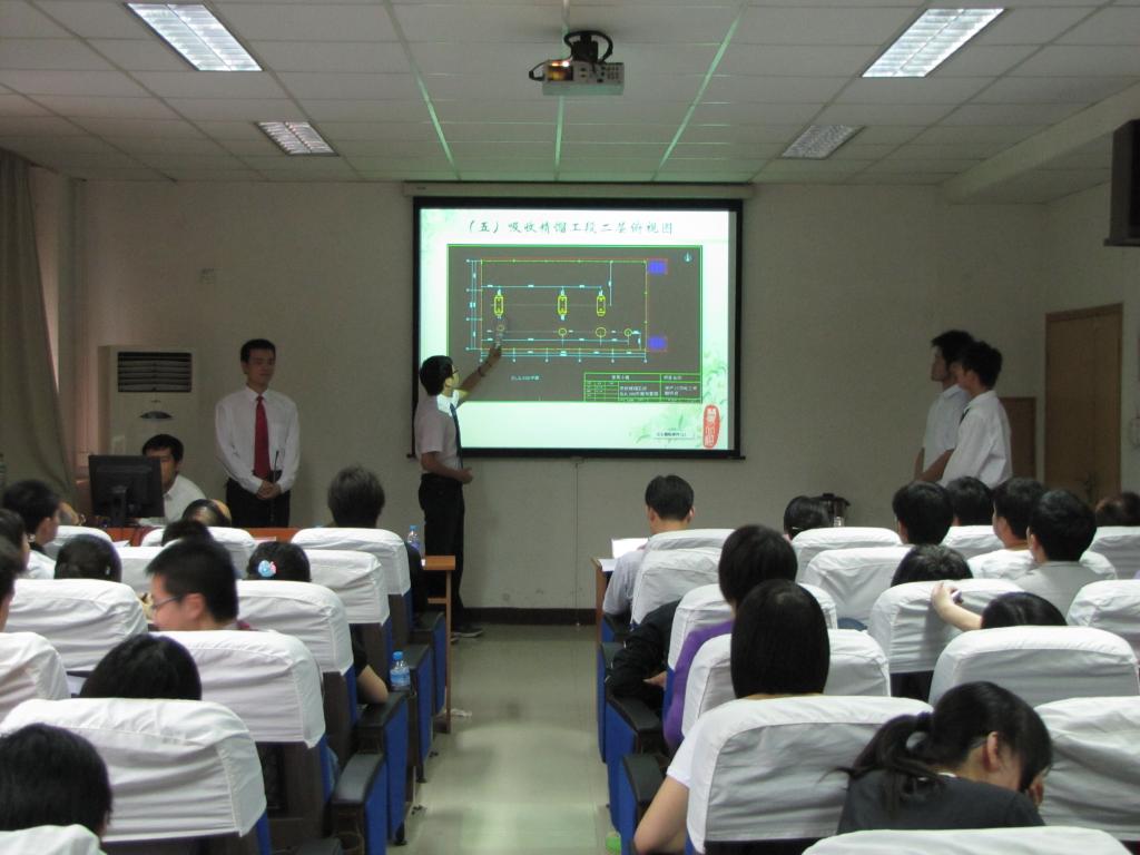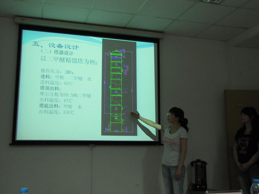 本次设计主要是结合化工设计课程,使学生了解化工工艺设计过程并学以致用,既是对学生创造性思维、设计能力的考察,也是对团队合作能力的考验。此次设计持续了近两个月,主要围绕二甲醚生产装置模拟工程进行,指导老师有陈立宇、刘荣杰、褚雅志。比赛中,答辩内容包括流程介绍、设备布置及选型等。每个队轮流上台介绍他们的设计方案,对配图加以解释说明,然后由评委老师进行提问,指出其中的不足,并提出进一步改进流程、完善设计的建议。比赛过程中,每个队都进行得井然有序,队员们分工合作,脸上洋溢着自信而骄傲的微笑。也许,这是他们第一次完成如此大型的设计吧。对于评委老师的建议,他们也都虚心接受,力求做到最好。