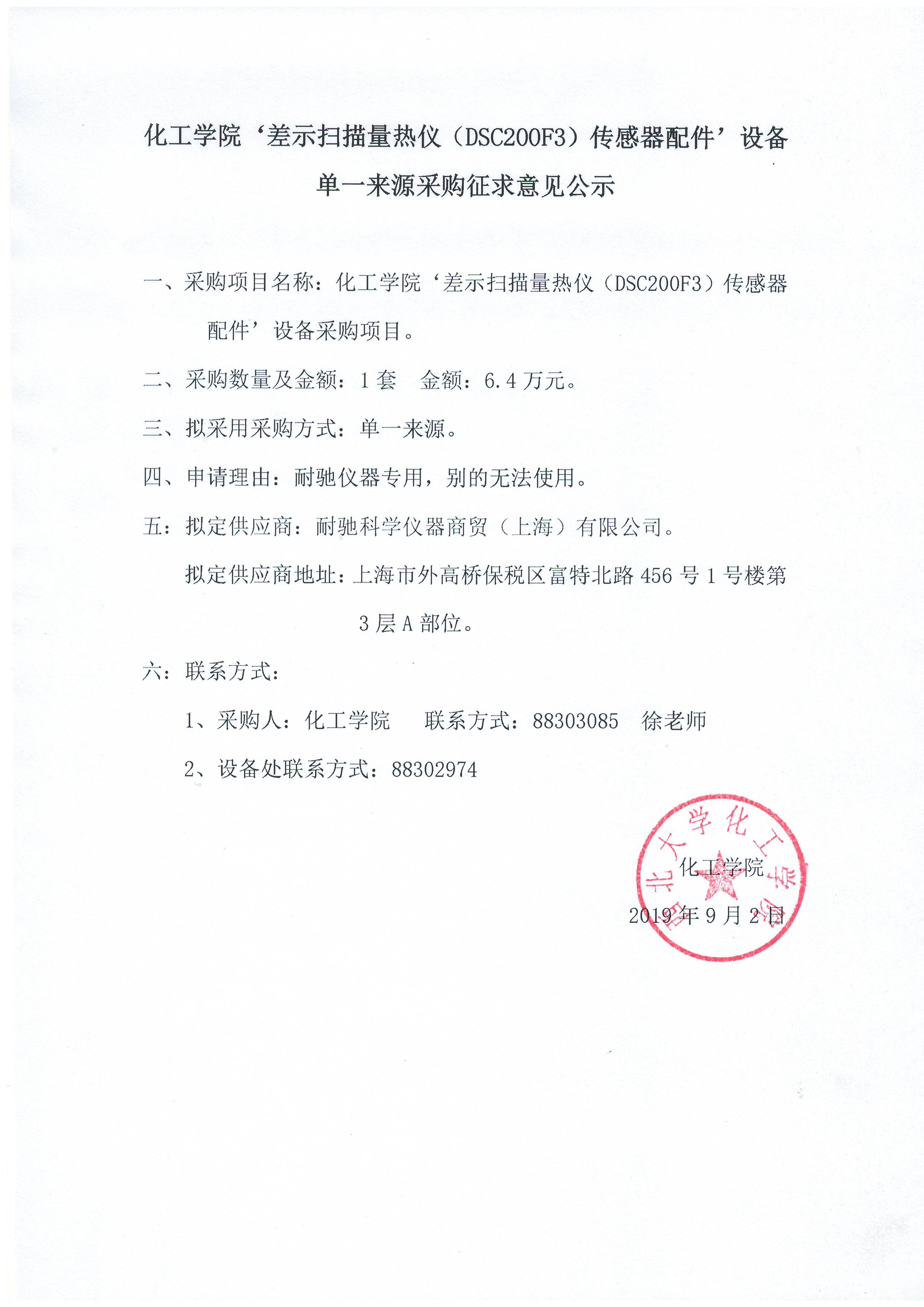 关于kaiyun官方登录入口‘差示扫描量热仪(DSC200F3)传感器配件’设备单一来源采购征求意见公示