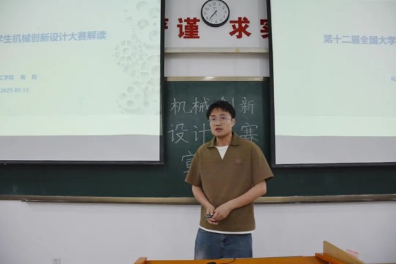 随后,杨阳从赛事介绍、往届回顾、本届题目、选拔方式等方面,系统地为同学们讲解本届机设大赛的相关内容。他说到,机设大赛旨在加强大学生的创新设计能力、综合设计能力与团队协作精神,提高学生针对实际需求进行创新思维、机械设计和制作等实际工作能力。同学们在备赛过程中应着重关注选题的创新性和实用性,设计的合理性和工艺性以及现场的展示力和综合表现等。此外,杨老师分享了往届参赛作品的相关内容。同学们认真聆听,详细记录,展现出对竞赛极高的热情。