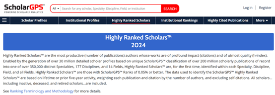 ScholarGPS汇聚全球各学科领域3000多万名学者的信息档案,融合海量论文、专利、书籍大数据资源,运用人工智能、数据挖掘、机器学习等先进数据科学技术,从研究成果(发表论文数)、影响力(引用次数,已排除自引)和论文质量三项关键指数,对全球超3000万学者和55000家机构,在14个领域、177个学科及超35万个专业的卓越表现展开全面排名。该榜单分为终身(Highly Ranked Scholar - Lifetime)和近5年(Highly Ranked Scholar - Prior 5 Years)两个类别,为衡量学者学术成就提供了全面且权威的参考。