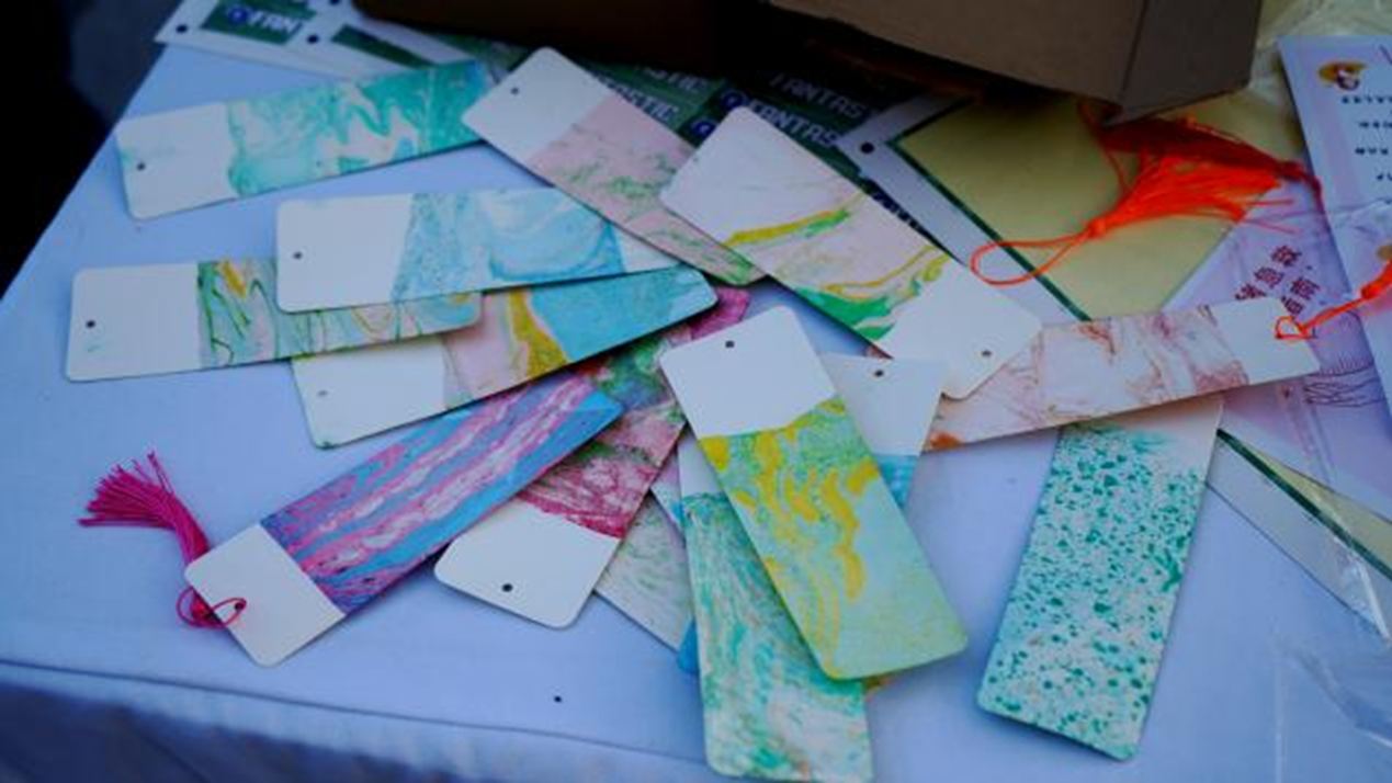活动现场气氛热烈,同学们踊跃参与,有序体验了漆染书签的制作过程。在负责同学的耐心讲解和指导下,同学们认真学习漂漆知识与技法,运用滴染、浸染等技巧,为书签上色,制作出独一无二的精美书签。在动手创作的过程中,同学们不仅感受到了非遗手工的魅力,也在沉浸式体验中舒缓了身心,深刻感悟到心理健康教育的内涵。