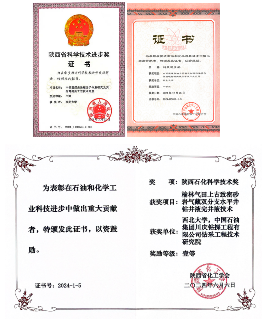 李冬教授及团队联合陕西煤业化工集团、中国石油集团川庆钻探工程公司、中国石化工程建设有限公司、陕西双翼煤化科技实业有限公司等单位,获得了陕西省科学技术进步二等奖、中国石油和化学工业联合会科技进步奖一等奖和陕西省石化科学技术一等奖。