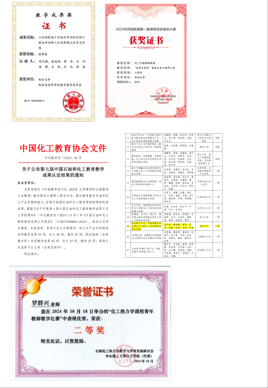 《以生物制造产业链为导向的生物工程本科创新人才培养模式改革与实践》荣获陕西省教学成果特等奖;《面向新兴产业,产教研融合的生物化工创新人才培养模式改革与践》荣获中国石油和化工教育教学一等奖,实现了学院教学成果新突破。同时,教师获西部联盟第一届课程思政案例大赛二等奖和全国化工热力学课程青年教师教学比赛二等奖。